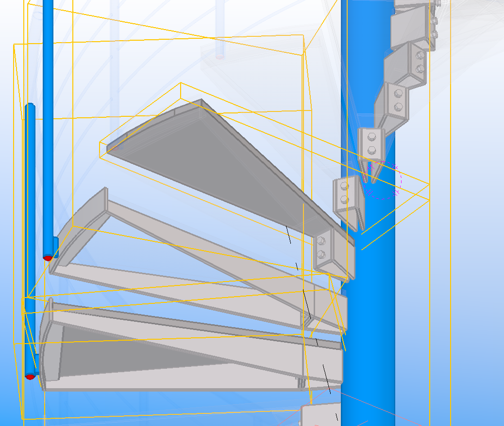 Naším klientom bol v domto prípade dodátateľ oceľovej konštrukcie, ktorý zúročil naše skúsenosti v 3D modelovaní a príprave dokumentácie pre výrobu skružovaných prvkov. V rámci služby sme klientovi pomohli odkomunikovať problém s podkladmi, nepresnou a nedoriešenou realizačnou dokumentáciou a odporučili niekoľko úprav je urýchlenie výstavby. Následne sme konštrukciu navrhli na montážne diely z hľadiska prepravy, hmotnosti jednotlivých dielov a dôrazu na tolerancie výroby. Aby bolo možné na vretenový stĺp presne privariť shodiskové diely, vytvorili sme výkres so šablónou v mierke 1:1, ktorou stĺp prekryli a presnú polohu vyznačili. Naším cieľom je myslieť na to, ako sa konštrukcia bude zhotovovať a montovať. Až následne sme konštrukciu staticky posúdili a dimenzie jednotlivých prvkov (hrúbky plechov, priemer rúry) upravili.